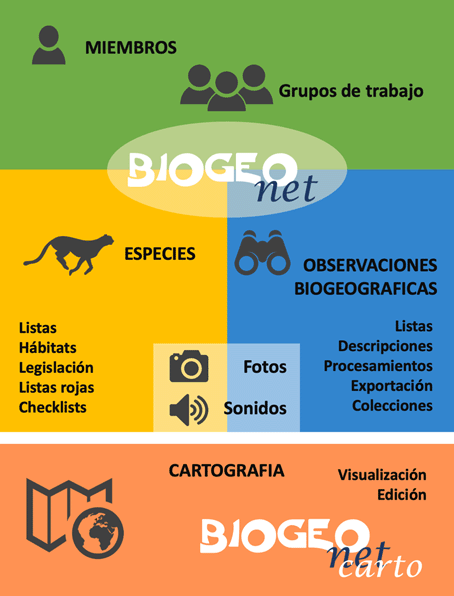 La base de datos, BIOGEOnet, se organiza en torno a tres ejes ilustrados en el siguiente diagrama: miembros, especies y observaciones biogeográficas.